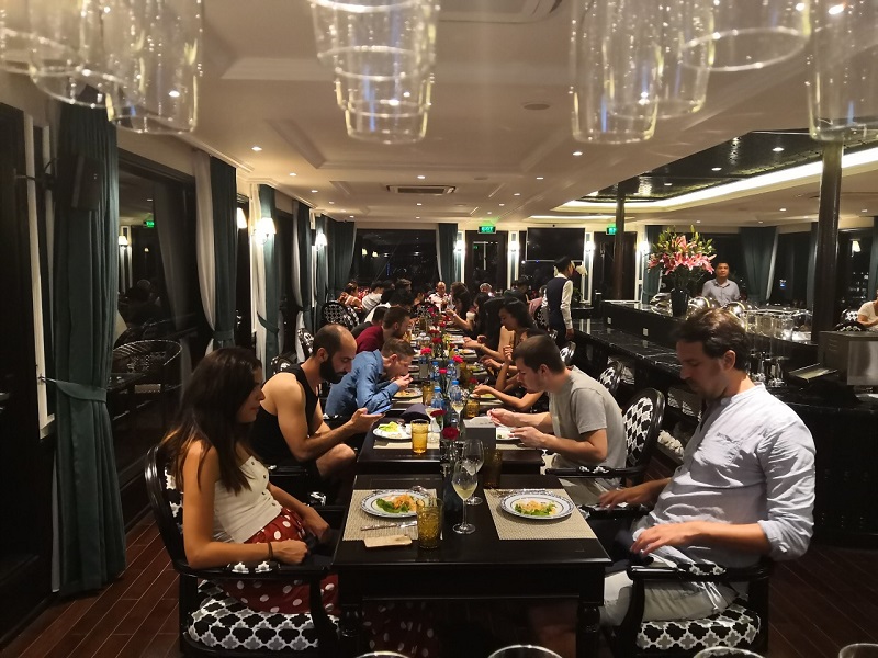 19h30: Ăn tối trên thuyền. Du khách sẽ được thưởng thức bữa tối tinh tế trong bầu không khí ấm áp và ấm cúng. Các món hải sản tươi sống, pha trộn giữa phong cách Việt Nam và phương Tây, hứa hẹn sẽ mang đến cho du khách một bữa ăn tối khó quên trong chuyến đi đáng nhớ này.